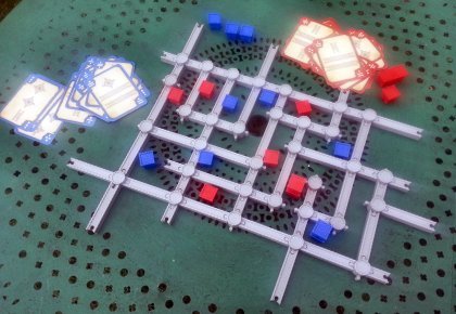 La petite boîte, bien pleine, contient quatre-vingt-huit éléments de construction plus vingt donjons permettant de marquer les cours créées. L'éditeur propose deux boîtes, l'une avec des pièces bleues et rouges, l'autre avec des pièces jaunes et vertes. Les deux boîtes réunies permettent de jouer à trois ou quatre. Je vous en reparlerai quand Thierry, mon vendeur-conseil lyonnais, m'aura dégoté la deuxième boîte, le jeu étant hélas mal distribué en France.