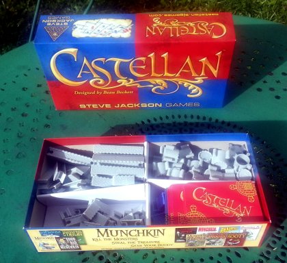 J'apprécie particulièrement les jeux à deux qui comportent une petite part de hasard. Le perdant peut en effet invoquer la malchance pour expliquer sa défaite. Dans Castellan, les deux adversaires disposent des mêmes forces, un jeu de quatorze cartes, mais elles n'arriveront pas toutes en main en même temps. Le but du jeu est de créer ensemble un château en s'y réservant les meilleures places. À la fin de la partie, chaque enclos rapporte au joueur qui y a posé un donjon autant de points que de tours qui la bordent. Une fois par partie, un joueur peut prendre possession d'une cour qu'il vient de créer en y posant un donjon double qui rapportera en fin de partie le double du nombre de tours. Avec un peu de chance, vous pourrez créer une grande cour. Vous serez alors le seul joueur autorisé à la scinder, si c'est intéressant, pour créer deux ou trois cours.