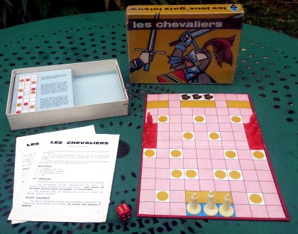 Dans une salle encombrée de murs et de colonnes, trois chevaliers blancs se proposent d'atteindre la salle des trésors. Six chevaliers rouges, les gardes, ne sont pas du tout d'accord avec ce projet. Les Chevaliers est un jeu asymétrique. Les objectifs et les mécanismes sont donc différents pour les deux joueurs. La difficulté, dans ce type de jeu, c'est d'équilibrer les chances de gain. Ici, la partie semble équitable. Il existe même une possibilité de partie nulle. Les Chevaliers a cependant bien vieilli, et n'intéressera plus aujourd'hui que les collectionneurs.