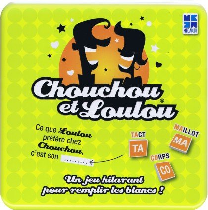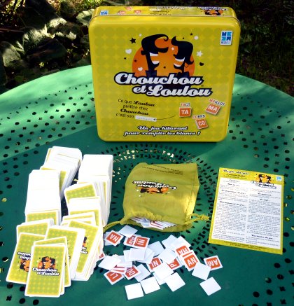 Chouchou et Loulou est un jeu d'ambiance qui gagne à être joué en équipes. Le principe n'est pas révolutionnaire : trouver un mot qui commence par deux lettres. Mais la réalisation est particulièrement soignée, et l'éditeur n'a pas fait preuve d'avarice en nous proposant pas moins de quatre cents cartes et cent vingt jetons ! Sur chaque carte, une petite phrase comporte un mot en blanc. Chaque joueur ou équipe dispose de quelques jetons qui montrent deux lettres. Il faut être le premier à annoncer un mot valable, commençant par ces deux lettres, pour compléter la phrase. Un mot peut être refusé par un vote des joueurs. Quelques exemples de phrases incomplètes :