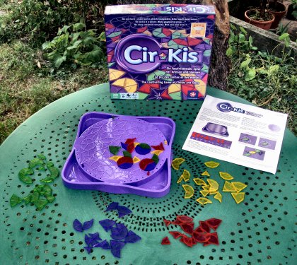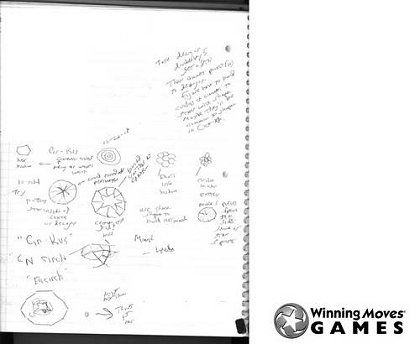 Ces trois objectifs, une fois atteints, permettraient d’obtenir un jeu commercialisable et étroitement lié à Winning Moves. La notion de plateau circulaire était vitale à mes yeux car il y a énormément de jeux (comme dernièrement le célèbre Blokus) qui utilisent une grille carrée sur laquelle on pose des “ominos” (qui sont des pièces couvrant un ou plusieurs carrés contigus de la grille). L’idée de développer un plateau circulaire fait venir immédiatement à l’esprit le mot “circus” (pour un Anglo-Saxon). J’ai transformé son orthographe en « Cir Kus » puis je me suis finalement décidé pour « Cir Kis ». Le logo de la société Winning Moves, “étoile à l’intérieur d’un cercle”, devint ma source d’inspiration pour dessiner le plateau. Il me semblait que former des étoiles et des cercles sur une grille était quelque chose de nouveau et que cela pouvait être la façon de marquer des points. La forme circulaire du plateau (dans sa partie jouable) offrait un autre avantage. Puisque le périmètre du plateau devait techniquement être « carré » pour tenir idéalement dans une boîte carrée, la partie extérieure au cercle (les angles du plateau) permettait d’inclure un espace de rangement et une piste de comptage des points. Je me suis décidé sur tout cela juste avant les vacances de Noël. Le 26 décembre, j’ai réalisé les premiers croquis du nouveau jeu dans mon agenda.