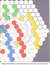 J’ai senti que je tenais quelque chose et, en multipliant ces formes sur Photoshop, j’ai commencé à remplir une grille plus grande avec dix cercles et cinq étoiles de plus. (Je me disais que seize formes à compléter pour marquer des points, ce serait suffisant pour un jeu rapide à quatre joueurs). J’ai réparti ces formes en les espaçant, pour faire joli. A ce moment, je n’étais pas particulièrement intéressé par la nature des espaces qui pouvaient relier les formes à compléter. Cela ne m’aurais pas gêné si j’avais eu besoin de plus de types d’espaces pour ce faire. Mais après essai sur Photoshop, j’ai découvert que je n’avais besoin que d’une seule forme supplémentaire (le « Sliver »), en plus de la « flèche » et de la « part de gâteau », comme je les appelais alors. La grille qui en a résulté prit forme inexorablement. Quand j’eus terminé, je fus séduit par sa symétrie et ses proportions. (En fait, les propriétés de la grille laissaient entrevoir qu’elle respectait probablement une théorie mathématique sur laquelle j’étais tombé sans m’en rendre compte).