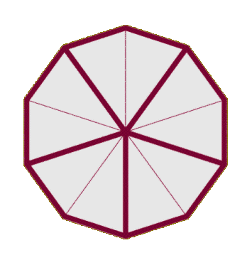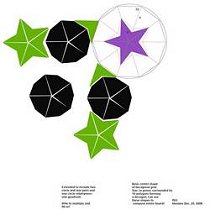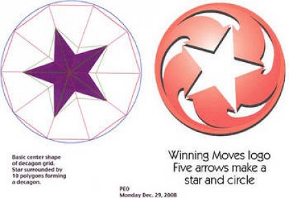 Puis vint la découverte capitale.Après avoir mis de côté la grille d’hexagones – cercles, je fis une étoile parfaite sur Photoshop et je dessinai des lignes radiales partant du centre de l’étoile et passant par les dix angles de son périmètre. Je réalisai que je venais de former un décagone. Un décagone, au moins, ça ressemble beaucoup à un cercle. J’avais donc une étoile dans un cercle, comme le logo Winning Moves. Puis, je divisai l’étoile centrale en cinq formes naturelles de « flèches » et le décagone en dix formes de « parts de gâteau » et j’équilibrai ensuite leurs tailles respectives. Le système de mesure de Photoshop confirma que les angles des « parts de gâteau » étaient de 72 degrés. Cela m’intéressa, car en alignant cinq de ces formes autour d’un point central, on crée un « cercle » de 360 degrés. J’avais à présent des étoiles et des cercles, chacun composé de cinq espaces.