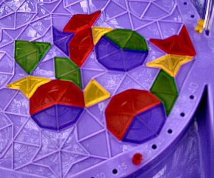 La règle du jeu vint rapidement. Chaque joueur aurait le même ensemble de pièces de couleurs. Les joueurs, à leur tour, poseraient leurs pièces en respectant une règle d’or : chaque pièce posée doit toucher celle placée par le joueur précédent (« suivre le leader »). Pour donner au jeu une dimension plus stratégique, j’ai imaginé des cas où l’on pourrait rejouer. Des panels de consommateurs fixèrent le nombre de points gagnés pour la couleur dominante sur une forme terminée (10 points) et le bonus pour celui qui termine une forme (5 points). Les pistes de marquage des points entourant la grille dodécagonale avaient suffisamment de trous pour marquer de zéro à quarante, en marquant de cinq en cinq. Gagner en étant le premier joueur à obtenir quarante points se révéla favoriser des parties pleines de suspense et plutôt rapides (ce qui est hautement désiré à l’heure actuelle).