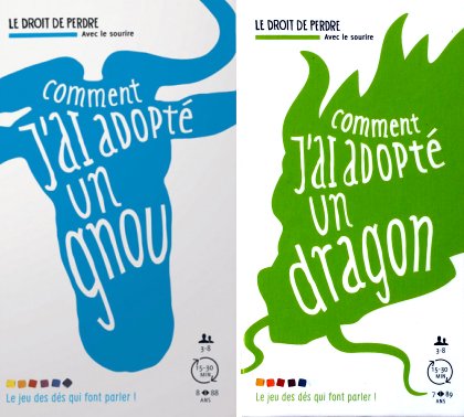 Les jeux d'improvisation mettent facilement de coté certains joueurs qui ont du mal à s'exprimer en public. Pour pallier ce défaut, il faut imaginer un dispositif qui facilite le récit. C'était par exemple l'excellente idée du téléphone factice dans Délirophone. Dans Comment j’ai adopté un gnou, l'objet qui facilite le récit est en même temps le nerf du jeu : une série de dés comportant des éléments de phrase. Le but est de raconter une histoire en intégrant ces morceaux de phrase dans le récit. On part d'un thème tiré au sort (ou choisi) et le récit s'enchaîne comme par miracle. Simple et amusant. 2016 : Comment j’ai adopté un dragon