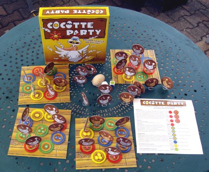 Destiné aux jeunes joueurs, Cocotte Party amuse également les parents. Dans ce jeu d'observation et de rapidité, il s'agit d'emplir le premier son poulailler avec des poules posées sur les nids.