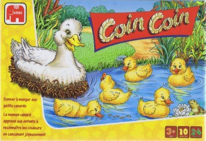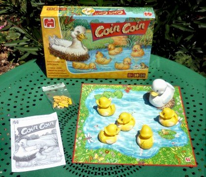 Coin Coin contient cinq canetons et une maman cane qui parle si on a pris soin de lui glisser deux piles sous les plumes. Chaque caneton a une couleur cachée sous son corps. Quand la maman appelle Jaune, par exemple, il faut soulever le caneton jaune. On gagne alors le droit de lui donner un bout de pain dans le bec : les canetons sont creux. Quand elle se met à cancaner, il faut déplacer les canetons en essayant de se souvenir qui est où. Puis la partie reprend. Simple mais amusant.