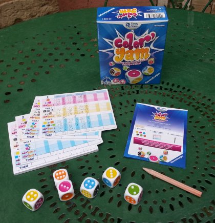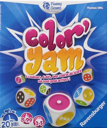Il ne faut pas se fier aux apparences, Color’Yam n'a pas grand-chose à voir avec Double Yam. Il ne faut pas non plus se fier au nom du jeu : si dans Color’Yam on lance bien des dés, à aucun moment il n'est question de faire un « yam » et donc d'obtenir cinq dés de la même valeur. L'idée directrice du jeu est, lors de dix manches successives, de faire le plus grand score possible pour ensuite comparer son score à celui des adversaires et marquer des points en conséquence. Lorsque trois joueurs participent, par exemple, le meilleur score rapporte 3 points, le second 2 points et le dernier 1 point. Vu comme ça, c'est simple. mais chaque manche a un critère basé sur les couleurs. Lors des deux premières manches, des couleurs sont imposées, par exemple « pas de bleu » ou « deux verts exactement ». Lors des quatrième et cinquième manches, il faut respecter des configurations de couleurs libres, par exemple « une couleur au choix en exactement quatre exemplaires » ou « aucune couleur en trois exemplaires ». Lors des septième et huitième manches, il faut respecter une comparaison de couleurs, par exemple « autant de verts que de bleus » ou « plus de bleus que de roses ». Un joueur qui ne parvient pas à respecter la consigne ne marque aucun point pour la manche. Mais il peut inscrire son score dans la ligne « Color'yam » du pôle en cours. Il y a quatre lignes de ce type mais il faut impérativement que chaque ligne soit supérieure à la précédente pour être valide. Le jeu est livré avec un bloc de feuilles de marque qui propose des séries de six manches différentes, ce qui permet des parties réellement variées. Très plaisant. |