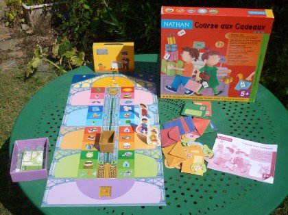 Bien sûr destiné aux jeunes joueurs, Course aux cadeaux familiarise agréablement avec l'argent : acheter, payer, rendre la monnaie. Le but n'est pas de s'enrichir, mais d'envoyer des cadeaux à ses amis ! Joliment réalisé et charmant comme tout, avec son petit ascenseur au centre du plan de jeu. On aurait envie de retourner en enfance. |