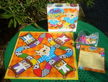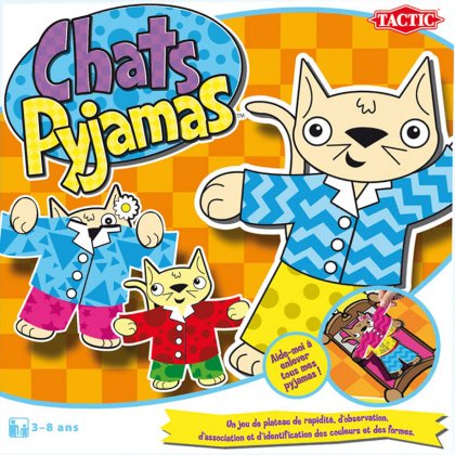 Chats Pyjamas est le premier jeu de strip-tease pour jeunes joueurs ! Les chats se sont couchés avec cinq épaisseurs de pyjamas : cinq vestes et cinq pantalons. Au hasard du dé, le pion arrive sur une case montrant soit un motif, soit une couleur. Tous les joueurs peuvent alors retirer les pièces de pyjama de cette couleur ou de ce motif. Si la pièce au-dessous est encore de la même couleur et/ou motif, ils peuvent continuer. Chats Pyjamas est un jeu d'observation et de reconnaissance de couleurs et de formes, pas un jeu de rapidité comme écrit sur la boîte. Mais rien ne vous empêche d'ajouter un peu de piquant en adaptant une variante de ce type. Variante avec rapiditéAprès avoir jeté le dé, chacun regarde où le chat doit aller, et s'il peut retirer une pièce de pyjama. Le premier joueur qui miaule, parmi les joueurs concernés, est le seul autorisé à retirer les pièces de pyjama de son chat. Mais s'il a miaulé à tort, il doit au contraire remettre un vêtement sur son chat !
