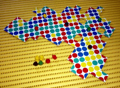 Lorsqu’un groupe comporte plus d’une marque, suite à une jonction, toutes les marques concernées sont retirées et défaussées. Fin de la partieLa partie se termine dès que l’objectif fixé en début de jeu est atteint. Chaque joueur ajoute alors à son score un nombre de points égal au nombre de disques dans les groupes terminés où il possède une marque. |
