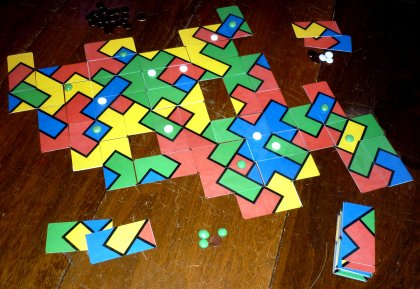 Fin de la partieLorsqu’un joueur a posé son dernier marqueur, il reçoit la plaque de valeur 5. Chacun des autres joueurs dispose alors d’un dernier tour (au cours duquel il peut jouer autant de fois qu'il le veut s'il possède assez de jetons), puis on procède au décompte. Chaque joueur additionne le nombre total de cases des territoires où il a posé un marqueur ; le joueur ayant terminé en premier ajoute à son total la prime de 5 points. Le joueur avec le meilleur score emporte la partie.