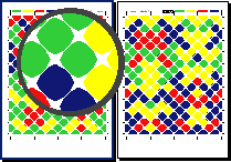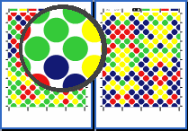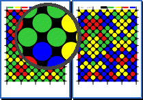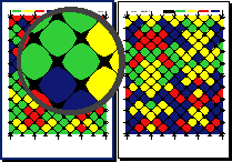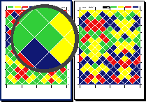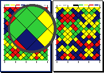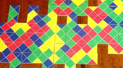 Comment les dominos sont-ils conçus ?Chaque joueur possède en main deux dominos réversibles. Chaque face du domino est coupée en huit demi-carrés - des carrés coupés par la diagonale. Les deux demi-carrés du centre du domino sont joints, et toujours d'une seule couleur.