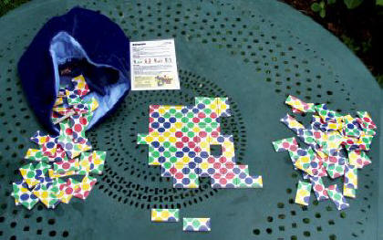 2006 : Dalapapa est en vente et il est tout rondAmis malhabiles, réjouissez-vous ! Vous n'aurez bientôt plus besoin de vous couper les doigts en tentant de réaliser votre Dalapapa. Mon petit doigt (intact, malgré le nombre de dalapapas qu'il a participé à fabriquer) m'a dit que le jeu verrait probablement le jour sur les étals des meilleurs vendeurs-conseils avant la fin de l'année. Le dessin retenu est la forme ronde, plus facile à lire, surtout pour ce qui est des groupes de couleurs. En avant-première, ci-dessous une photo du premier prototype :