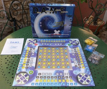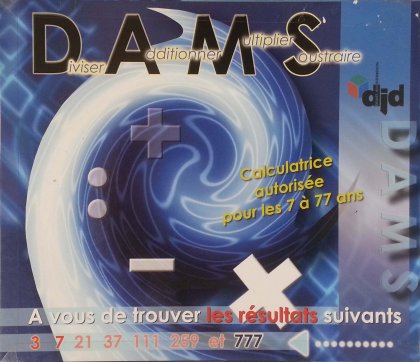 La famille des jeux de nombres croisés est riche de tentatives plus ou moins réussies. Le jeu le plus intéressant dans cette famille est certainement Mathable, suivi de très près par Zatre. Dams, acronyme de Diviser Additionner Multiplier Soustraire, est un jeu riche de possibilités, peut-être un peu trop complexe pour de nombreux joueurs. Si vous n'êtes pas passionné de jeux de chiffres, je ne pense pas que ce soir Dams qui vous fasse changer d'avis. Le but du jeu est très original : être le premier joueur à parvenir à former successivement les sept résultats 3, 7, 21, 37, 111, 259 et 777 à l'aide de vos chiffres et signes mais aussi en réutilisant ceux placés auparavant par vos adversaires. Le défi est difficile. Heureusement, chacun dispose de dix jokers qui lui permettent de piocher, remplacer ou déplacer des chiffres ou signes. À réserver aux amoureux transis de jeux de nombres.