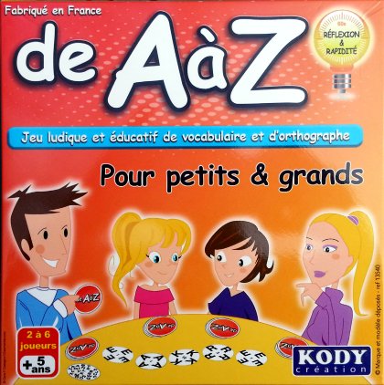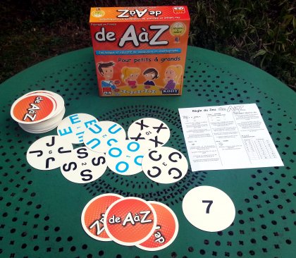 De A à Z est basé sur un principe commun à de nombreux jeux de lettres : trouver rapidement un mot utilisant plusieurs lettres exposées. Ici, pas trop de stress : vous disposez d'une minute pour trouver un mot. La seule contrainte est qu'il doit comporter un nombre minimum de lettres. Les cartes rondes attirent l'œil, et les petits se mêlent facilement aux plus grands pour des parties courtes et animées. On peut adapter facilement la difficulté en ajoutant des handicaps, comme par exemple exiger une lettre supplémentaire pour le joueur en tête du score.