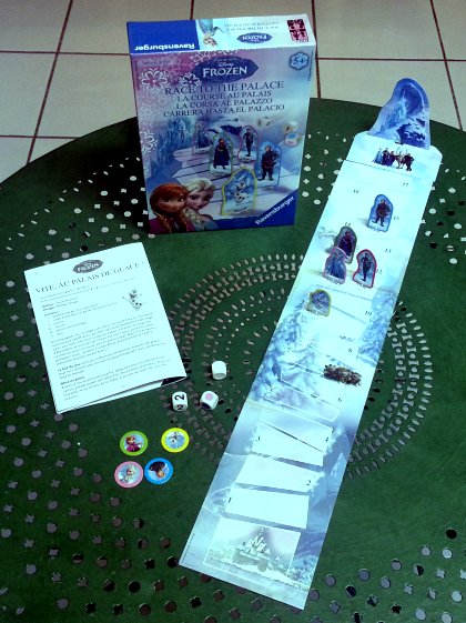 Disney Frozen La Course au Palais est une course à objectif secret : chacun tire au début le personnage qu'il doit faire gagner. Le joueur actif lance trois dés et doit avancer les pions désignés du nombre de case indiqué. Une face blanche permet d'avancer le pion de son choix. Comme la figurine rouge n'appartient à personne, il est tentant d'avancer celle ci, mais si elle gagne la course, tout le monde a perdu !