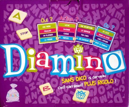 Ne vous y trompez pas. Il n'y a aucun rapport entre Diamino et Diamino - sans dico ni cerveau c’est carrément plus rigolo !, sinon que l'éditeur est le même (ce qui lui donne le droit d'utiliser un nom de jeu datant de 1935 comme bon lui semble) et que l'on utilise des jetons de lettres. La règle se veut dans l'air du temps : rapide et facile, pour attirer un public de jeunes zappeurs. Elle est agrémentée d'un humour qu'on n'a plus connu depuis la fin de la conscription. Enfin, en cas de doute et si vous croyiez avoir enfin mis la main sur le jeu de lettres qui, jadis, avait ravi votre jeunesse, on vous l'annonce fièrement en dos de couverture : « Diamino est un jeu sans prise de tête qui ne se joue pas en maison de retraite ! » Je passe…