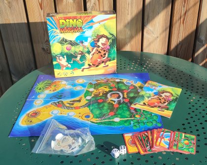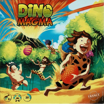 La chasse aux œufs est ouverte ! Pour être sacré meilleur chasseur de la tribu, il faut être le premier à rapporter au village trois œufs de couleurs différentes. Dino Magma, une aventure ludo-éducative à rebondissements qui ravira toute la famille ! Contenu : 1 plateau, 6 pions-personnages, 22 cartes dinosaures, 2 dés Un jeu de course et de collecte commandé par les dés.