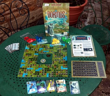 Si vous avez aimé King of Siam, vous allez trouver un air de famille dans Dokmus. La manière de développer ses pions, en les posant à côté de pions déjà posés est en effet très semblable. Mais là s'arrête la comparaison. Dans Dokmus, aucun hasard. Mais pas mal d'incertitude quand aux décisions des adversaires qui joueront avant vous. Vous marquez des points en amenant vos tribus à côté des temples. Des primes importantes sont offertes à ceux qui côtoient tous les temples d'une tuile ou de nombreuses tuiles. Le souci, c'est que le terrain est très mouvant. Les tuiles tournent et se déplacent, parfois en sautant par dessus une autre tuile. La capacité de modifier le terrain s'acquiert en choisissant un rôle au début de chaque manche. Plus le rôle est puissant, plus vous jouez tard ce qui vous fera peut-être prendre une ou deux places convoitées. Si vous cherchez un jeu d'ambiance, oubliez Dokmus. Si vous aimez les choix difficiles basés sur des règles simples, alors vous allez vous régaler.