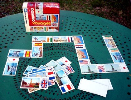 Les pièces représentent sept pays. Pour chaque pays, trois dominos portent un drapeau, trois autres une photo et le dernier, le double-domino, porte le drapeau et la photo. Il est un peu dommage qu'une seule photo, très stéréotypée, ait été choisie : l'occasion était pourtant offerte de proposer quatre photos différentes pour chaque pays afin d'en montrer divers aspects. |