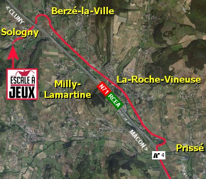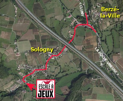 Plan d'accès à l'Escale à jeuxVenir par la routeSuivez votre carte ou votre GPS jusqu'à Sologny (71). Entrez dans le village et suivez « Le Bourg ». La route monte un peu, passe dans un tunnel sous la voie rapide et le TGV. Continuez. Laissez la mairie sur votre droite, puis l'église également sur votre droite (comme ça, pas de jaloux). Vous arrivez à un petit croisement. Ne prenez pas en face (Château de Byonne) mais à droite, sans vous laisser impressionner par le panneau « impasse ». Vous êtes rue du Bourg. Un peu plus loin, vous avez le choix entre deux routes : prenez celle de gauche, un panneau indique d'ailleurs que c'est le chemin vers « La Place ». Vous arrivez enfin vers un lotissement neuf.