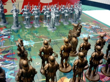 Quelques précisionsAprès avoir contacté l'auteur, Max Gerchambeau, je suis en mesure d'apporter quelques précisions supplémentaires. Sur la règle du jeuUne précision importante qui manque à la règle originale : les prises s'effectuent en sautant comme aux dames, que l'assaillant soit un chevalier ou un simple soldat. Il est possible, pour un chevalier, d'approcher en sautant un ou plusieurs pions de son camp, puis de prendre une ou plusieurs pièces adverses en continuant à sauter. Les pions qui arrivent en dernière ligne ne peuvent plus avancer. Ils ne sont pas promus, comme aux dames mais peuvent se déplacer latéralement pour essayer d'occuper la citadelle adverse. Sur le tablierIl a été dessiné par des étudiants allemands qui travaillaient sur les décorations des Galeries Lafayette. Le dessin a été réalisé en « paiement » des repas qu'ils prenaient chez l'auteur, qui tenait un restaurant vers le Champ de Mars à Paris !