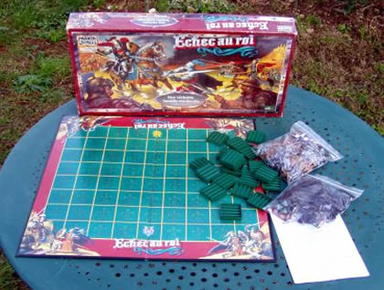 À mi-chemin entre le jeu d'échecs et le jeu de figurine, Échec au roi ne satisfera probablement aucune des catégories de joueurs concernées. La mécanique est simple : deux actions par tour au choix parmi avancer, pivoter ou attaquer. Les attaques se règlent aux dés. Le jeu est bien réalisé et la seconde façon de jouer, en préparant secrètement son armée derrière un paravent, est même assez séduisante. Mais Échec au roi n'est pas non plus indispensable dans une collection (sauf la mienne, bien sûr). |