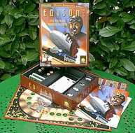 soit la règle de base, soit la règle avancée. Les règles proposées pour trois ou quatre joueurs jouant individuellement aboutissent effectivement sur un jeu totalement délirant, où personne ne peut maîtriser quoi que ce soit, et qui peut de fait aboutir à un rejet du jeu. Il peut également être intéressant de jouer à cartes découvertes, sans cacher ses objectifs. Mais dans ce cas-là, Edison & Co. devient totalement « prise de tête ». Comme tous les jeux Goldsieber Spiele, Edison & Co. est présenté de manière absolument splendide, avec des véhicules en métal, et des graphismes de Franck Vohwinkel qui nous plongent dans un univers à la Jules Verne. |