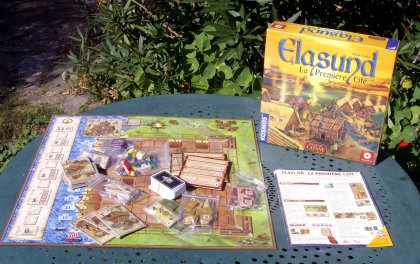 Placé dans l'univers des Colons de Catane, Elasund nous fait revivre la création de la première cité. Les joueurs sont donc des bâtisseurs qui élèvent ateliers, commerces, remparts et, cerise sur le gâteau, une église parce qu'il faut bien s'occuper du repos de l'âme. On retrouve quelques mécanismes déjà utilisés dans Les Colons de Catane comme le fameux dé et son tirage de 7, qui fait venir les pirates. Mais ici, l'un des joueurs est complice des pirates, et oriente leur attaque plutôt vers ses concitoyens (une véritable honte pour laquelle la règle devrait imposer de construire un petit bout d'église en pénitence).