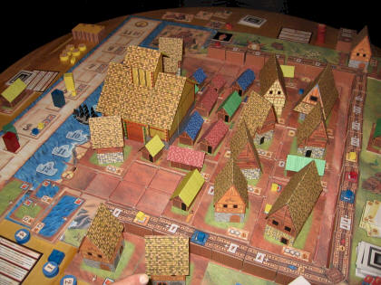 Le but du jeu est de marquer 10 points de victoire. Pour cela, il faut bâtir des ateliers ou des échoppes. Mais ces activités, si elles rapportent rapidement de l'or, ne peuvent suffire à assurer votre gloire. Pour gagner, il faudra se lancer dans des œuvres collectives, non rémunératrices en or, mais productives de notoriété, comme les remparts ou l'église. Une forte interaction existe entre les joueurs. Il est par exemple possible de réquisitionner des constructeurs d'autres joueurs pour bâtir son édifice ; il faut bien sûr les payer, mais cela peut contrecarrer les plans de vos partenaires. Et il est toujours agréable de contrecarrer les plans de nos compagnons de jeu ! Il est juste un peu dommage que les dessins des bâtiments soient aussi tristounets. Réalistes d'accord, mais tristounets. On a du mal à distinguer les fonctions des bâtiments autrement qu'en regardant ce qui est écrit au dos. Mais cela n'est qu'accessoire tant le plaisir du jeu est grand, même à deux joueurs. Indispensable. |