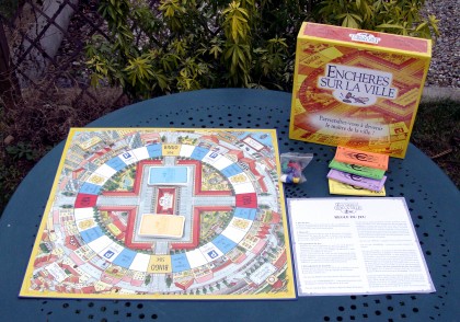 Les joueurs qui attaquent une partie d'Enchères sur la ville ne sont pas de prime abord déroutés par des règles étranges. Le jeu ressemble volontairement à son aîné, mais se révèle rapidement beaucoup plus tactique. L'argent y est plus que restreint et la chance réduite, puisque tous les achats se font aux enchères, peu importe celui qui est tombé sur la case du bien à acquérir. De la même façon, il est possible de lancer une O.P.A. sur un bien détenu par un autre joueur. Vous pouvez éventuellement bluffer pour lui faire perdre un peu d'argent, puisqu'il est obligé de surenchérir sur votre offre, pour ne pas se voir privé de son magnifique restaurant. Bien sûr, il reste beaucoup de hasard dans les cases où l'on atterrit. Peut-être trop pour les amateurs de jeux exclusivement cérébraux. Mais je crois, pour ma part, que ce jeu facile d'accès peut être un redoutable agent de contamination néo-ludique. |