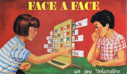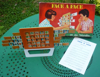 Deux joueurs s'affrontent Face à face, d'où son titre. Posée entre eux, on trouve une sorte de grille verticale, avec des rangées coulissantes, un peu comme dans Passe-murailles. Face à face est cependant plus proche, dans son principe, de X-Plus. Chacun essaye de réaliser de son propre côté un alignement de cinq cases, en espérant que son adversaire n'y parviendra pas avant lui. L'un des joueurs doit aligner des portraits de filles, l'autre de garçons. Face à face pourrait trouver ses limites dans le fait que les rangées coulissantes ne soient pas interchangeables. Toutefois, les possibilités d'alignement sont nombreuses : sur chaque tirette, il y a deux garçons et deux filles de chaque côté.