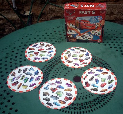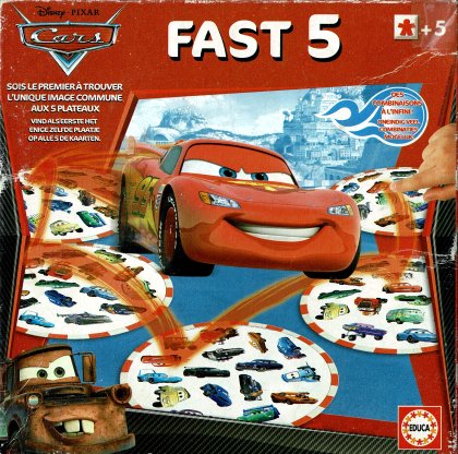 Trente-deux objets sont dessinés, tantôt au recto, tantôt au verso de chacune des 5 cartes de Fast 5,. Dans la version présentée ici, il s'agit de voitures. Dans d'autres versions, il s'agira de princesses ou d'animaux. Quelle que soit la façon dont les cartes sont disposées, une seule image commune apparaîtra sur les cinq cartes. Il ne s'agit pas d'un miracle mais de l'application d'un principe mathématique simple. Chaque nombre de 0 à 31 a une représentation binaire de 5 chiffres "0" ou "1" selon la présence dans sa décomposition des valeurs 1, 2, 4, 8 et 16 (5 premières puissances de 2). Par exemple, le nombre 14 est composé de 0×1 + 1×2 + 1×4 + 1×8 + 0×16. Sa représentation binaire est donc 01110. Il suffit, dès lors, d'attribuer à chacune des 5 cartes une puissance de 2. Sur la carte "1", les objets dont la décomposition binaire contient la valeur 1 (en clair, les nombres impairs) seront dessinés au verso, ceux qui ne le contiennent pas, au recto. Les cartes "2", "4", "8" et "16" seront composées de même.