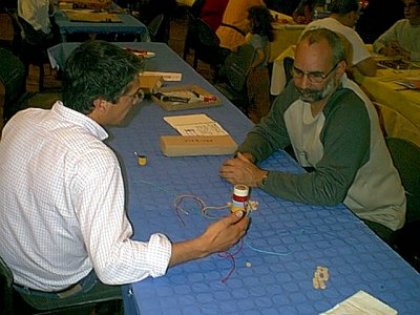 44 auteurs en compétitionLe mot compétition est un tant soit peu usurpé car l'on vient à Besançon d'abord et avant tout pour avoir des avis (voire des confirmations) sur les jeux que l'on présente. Dans la magnifique salle du Kursaal, ce qui impressionne en premier lieu, c'est cet alignement de tables bleues et jaunes avec à chaque fois un auteur qui présente dans le cadre du concours un jeu et peut également en avoir d'autres sous la forme de prototypes ou de jeux déjà édités.