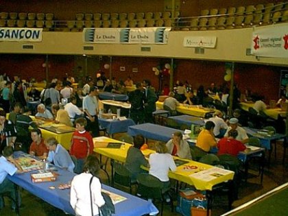 La diversité est au programme car cela va du jeu de stratégie pure en passant par des jeux d'ambiance à des jeux de plateaux plus classiques. Les noms des jeux sont les plus variés, mais je constate quand même une dominance de noms de jeux qui se terminent par une consonance en O (11 sur un total de 44 avec Quarrelo, Reverso, Colorio, , Auto-Géo, Illico Presto, Cuminos, Ogemo, Kemozako, Fromagot, Dengoduo…) et n'ai aucune forme d'explications pour expliquer cette tendance ! Pour les auteurs, c'est la même chose puisque l'ensemble de la France est assez bien représenté (et pas simplement Les Lyonnais comme pourraient le laisser entendre certains...) avec également 1 Italien et 1 Hollandais qui sont aussi du voyage. Ce melting-pot est extrêmement sympathique et contribue certainement largement à la réussite de la chose car à Besançon ce n'est pas simplement le festival mais aussi tout le "off" avec des groupes informels qui se constituent pour aller s'abreuver (toujours modérément) à une tablée de café, casser la croûte autour d'une cancoillotte et bien souvent refaire le monde… Le cru 2002Je suis allé à Besançon simplement 3 fois, il m'est donc difficile de faire un comparatif analytique de la production sur sept ans, mais, pour ce que j'en ai vu et entendu, il semblerait que 2002 soit une année à tout point exceptionnelle avec plus d'une quinzaine de jeux qui méritent largement le détour. Je regrette simplement, qu'à l'exception de TF1 Games, qui avait fait le détour pour venir le premier jour de la manifestation, il n'y ait pas plus d'éditeurs qui soient venus aussi bien pour encourager cette initiative que pour détecter quelque chose susceptible de les intéresser… Si Composio sort chez l'éditeur précédemment mentionné cette année, c'est qu'il avait été détecté sur place (mais non primé) en 2001. De plus, il me semble que le vent de créativité qui souffle sur cette manifestation n'a absolument rien à voire avec ce que l'on peut trouver plus au Sud de la France en début d'année…