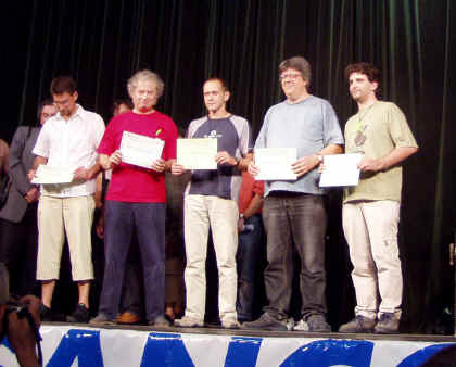Le podium, avec de gauche à droite : Johann Aumaitre, Claude Leroy, Jean Georges, François Haffner et Nicolas Normandon. Boucle d'Or pour Jean Georges, avec Tchag, un jeu de pion original dont le plateau va en se rétrécissant :