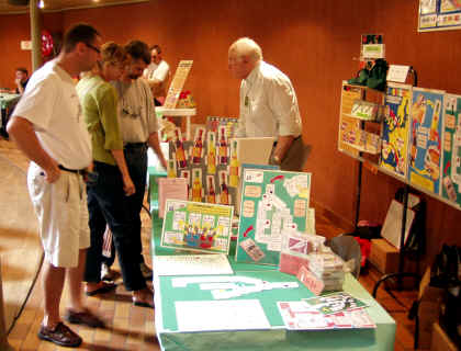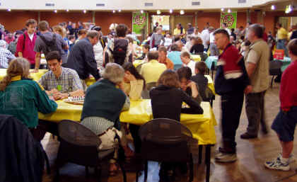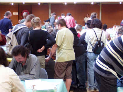 Cette année était pour moi une grande première puisque je présentais un jeu pour la première fois après avoir fréquenté à deux reprises le festival en touriste. J'ai donc dû rester devant mon jeu la plupart du temps et je n'ai eu le temps d'essayer que les jeux très courts, et encore pas tous. En particulier, je n'ai pu assister qu'à un morceau de partie du jeu de Jean Georges qui recevra la Boucle d'Or. Mon mini-reportage se limitera donc à quelques photos d'ambiance et à celles des jeux lauréats. Beaucoup de visiteursPour la première fois, tous les auteurs étaient regroupés dans la grande salle du Kursaal. La foule était souvent nombreuse et on se marchait un peu sur les pieds. C'était cependant bien agréable pour les créateurs qui trouvaient facilement des testeurs pour leurs jeux.