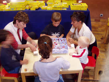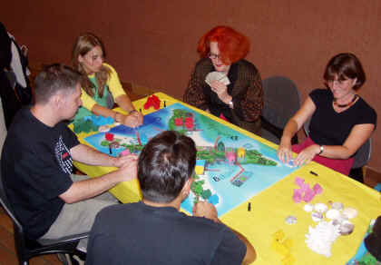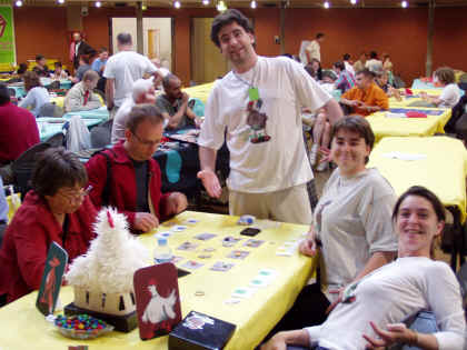 Une partie de Maka Bana avec de gauche à droite Valéry Fourcade, Morgane Fraga, Roberto Fraga (de dos), Alice Lucot de l'ALF et Florence Fraga. Roberto se demande si Florence va oser se mettre en Bikini (jeu de mot foireux réservé aux initiés ayant déjà joué à Maka Bana ; les autres n'avaient qu'à venir à Besançon) Nicolas Normandon, mention spéciale pour Des œufs nés en paix que je n'ai malheureusement pas eu l'occasion d'essayer :
