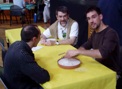 Pascal Le Guern, journaliste et membre du Jury, de dos, s'apprête à affronter Johann Aumaitre sous le regard amusé de Didier Panthout. Voir aussi |