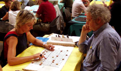 Marie-Claire Schwery, membre du jury et représentante des ludothèques suisses joue contre l'auteur, dans une ambiance de franche rigolade. Boucle de Bronze pour François Haffner, avec Maka Bana dont on reparlera bientôt :