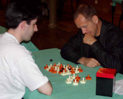 Jean-Georges, à droite, se concentre pour essayer de gagner à son jeu qui a séduit tous ceux qui l'ont essayé. Boucle d'Argent pour Claude Leroy, avec un jeu plus abordable que ses créations précédentes, dont personne n'avait noté le nom (il faut dire que les organisateurs ne diffusent ni la liste des participants ni celle de leurs jeux, ce qui ne facilite pas la tâche des reporters), et qui s'appellerait Gambo :
