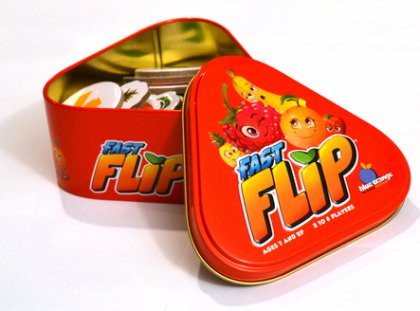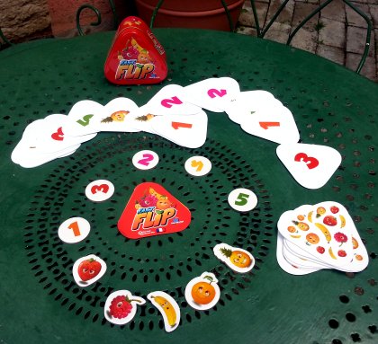 Fast Flip appartient à la grande famille des bouchons et totems. Ici, vous ne trouverez pas un totem mais dix gros jeton en carton épais. Il vous faudra être le plus rapide à attraper le jeton adéquat. Chaque carte représente quinze fruits, un premier fruit seul, un second en deux exemplaires, un troisième en trois exemplaires, un quatrième en quatre exemplaires et un dernier en cinq exemplaires. Toutes les cartes forment un tas face visible. On retourne alors la première carte…