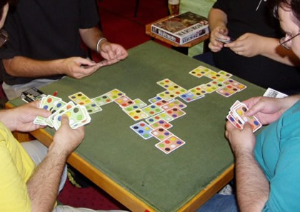 Chaque joueur possède un paquet de cartes avec six couleurs disposées différemment. Dès que le signal de départ est donné, chacun s'efforce de se débarrasser de ses cartes, en les posant sur les cartes déjà étalées, de telle sorte que les couleurs qui se recouvrent soient identiques. « Et si on se trompe ? », me direz-vous. Pas grave, car à la fin de la manche on retrouve facilement les erreurs en « déroulant » le jeu à l'envers. Et toutes les erreurs coûtent à leur auteur. Chacun joue à son niveau. Les plus forts essayent d'écraser les autres, les moins rapides se contentent d'améliorer leurs performances. Indispensable.