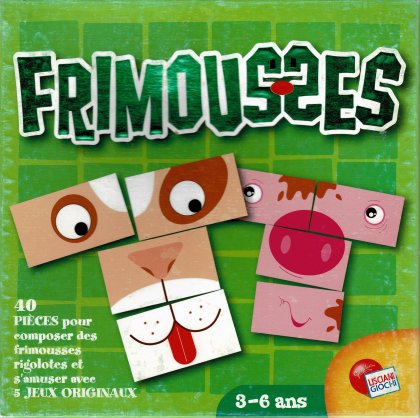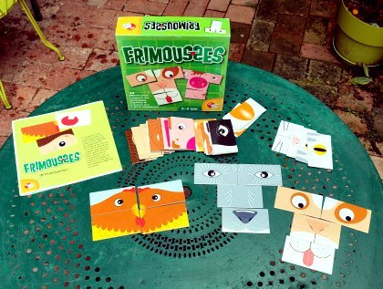 10 têtes d'animaux sont représentées avec 4 cartes. Il s'agit, dans le jeu Frimousses d'être le plus rapide pour en reconstituer le plus grand nombre. Les apprentis généticiens peuvent aussi composer des chimères