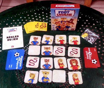 À son tour, le joueur actif commence par échanger une carte montrant un de ses joueurs visibles avec l'une des huit cartes qui l'entourent. La carte dont il prend la place est alors retournée. Les serpents qui apparaissent provoquent des événements. Et si vous révélez un joueur de l'équipe adverse, tant mieux pour lui ! Il n'y a pas de temps mort à Foot Savane. On peut tenter de mémoriser les tuiles retournées mais on y renonce très vite tant le terrain change tout le temps d'aspect. Lorsqu'on tente un but, une petite part de hasard intervient, comme dans la vie réelle. Le gardien de but va plonger à gauche ou à droite — c'est une carte tirée au hasard qui le détermine — et si vous avez visé l'autre côté des cages, vous marquez !