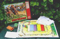 La règle (traduite par Marc Laumonier) est très originale. Les joueurs disposent de sets de cartes à peu près équilibrés. Dans l'ordre de la course, chacun joue une carte. Le joueur qui pose la carte la plus forte avance son lévrier d'un nombre de cases égal à la différence avec la deuxième carte. Si vous avez parié sur un autre lévrier que le vôtre, vous pouvez discrètement retenir votre champion. Mais le problème principal qui se pose aux joueurs, c'est la hauteur de la carte à jouer. Si un joueur a par exemple posé le 20, qui est la plus forte carte, il va avancer de sa différence avec la deuxième carte. Il faut donc qu'un joueur pose une carte assez forte pour atténuer son bond. Oui, mais pourquoi serait-ce à moi de la poser cette carte ? Après la première course, on attaque une deuxième course qui dure deux tours, mais permet aux deux plus fortes cartes d'avancer de leur différence avec la troisième carte. Une troisième course se déroule enfin sur trois tours, et ce sont trois lévriers qui avancent à chaque fois. Un excellent jeu de course, original et drôle. Merci Marc… |