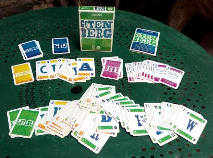 J'ai souvent défendu l'idée qu'une piste intéressante dans la création de nouveaux jeux de société est de mélanger deux mécanismes ou caractéristiques qui n'ont pas encore été rassemblés. Gutenberg est un jeu de mots (ce qui n'est pas nouveau) et un jeu de présélection ou draft (ce qui n'est pas nouveau). Mais à ma connaissance c'est un mélange qui n'a pas souvent été proposé et, en tout cas, pas parmi les plus de 8700 jeux de ma collection au moment où j'écris cet article. Les quatre premiers tours de jeux consistent à présélectionner cinq cartes une à une en passant les cartes non retenues à votre voisin. Il faudra ensuite composer le mot le plus intéressant, ce qui permettra de mettre deux cartes de côté pour la phase finale au lieu d'une seule. On peut aussi relever un défi, ce qui permet souvent de gagner une carte supplémentaire. Lors de la phase finale, on va composer un mot avec les cartes gagnées lors des premiers tours de jeu. C'est cette phase finale, et elle seule, qui déterminera le vainqueur. Difficile de faire du neuf avec les jeux lexicaux. Mais force est de constater que Robin David nous propose, avec Gutenberg, un jeu vraiment intéressant qui pourra peut-être convaincre les amateurs de jeux « modernes » de s'essayer à un jeu de lettres.