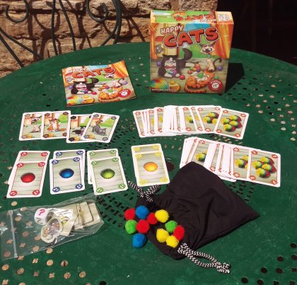 Les jeux de société permettent à chacun de jouer des rôles très différents : pirate, princesse, gangster, épidémiologiste, boursicoteur, etc. Dans Happy Cats, vous incarnez un chat qui raffole des pompons et essaie d'en attraper un maximum, si possible de sa couleur préférée. À chaque nouvelle manche, un dé décide de l'enjeu : on pourra enchérir pour gagner de 2 à 5 pompons, enchérir pour gagner le nombre de pompons de sa carte gagnante ou choisir parmi diverses opportunités. Comme tout cela vous prive d'une carte, il est parfois utile de jouer sa carte chat qui permet de ne pas participer au tour pour piocher une nouvelle carte. Tout l'intérêt du jeu réside dans ce manque constant de cartes. En gros, on passe environ la moitié de ses tours à ne pas participer aux enchères pour piocher une seule carte. Mais comme vous jouez à chat depuis votre plus petite enfance, je ne doute pas que vous allez vous en sortir brillamment.