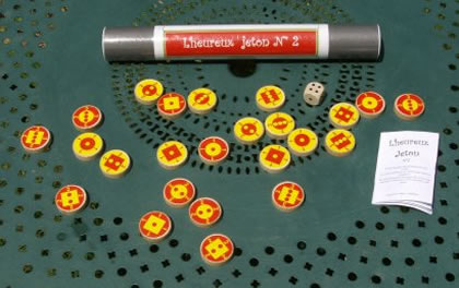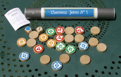 L'Heureux Jeton N°1L'Heureux Jeton N°1 contient 24 pièces numérotées de 1 à 6 dans 4 couleurs, ainsi que deux dés, l'un avec des chiffres, l'autre avec des couleurs. L'auteur propose 7 règles très simples, réunissant autour du jeu de 2 à 6 joueurs : Le Frère (2 à 6 joueurs)Trouver des pions portant le même chiffre ou la même couleur. Des variantes proposent d'accoupler des pions dont la somme fait 7 ou la différence fait 3. Chacun sa couleur (2 à 4 joueurs)Chaque joueur doit trouver les jetons de sa couleur. Si on retourne un jeton d'une autre couleur, il y en a toujours un qui est très content. L'Escargot (2 à 6 joueurs)Les joueurs forment une spirale de pions ayant chacun une caractéristique commune avec le pion précédent. Le premier qui a placé tous ses jetons a gagné. Je prends, je laisse (2 à 6 joueurs)Les joueurs retournent un jeton et jettent le dé de couleur. Ils peuvent prendre le ou les jetons déjà retournés de cette couleur. La Course (2 joueurs)Les joueurs doivent retrouver le plus vite possible les pions de leur couleur dans des lignes composées des jetons de 4 couleurs cachées. Suivez-moi (2 à 4 joueurs)Le jeu utilise la caractéristique des flèches sur les jetons. Il faut trouver les jetons qui pointent dans la bonne direction. Disparaissez (2 à 4 joueurs)Il faut faire disparaître ses jetons en tirant les dés qui indiquent la couleur et la valeur du jeton à retourner. Lorsque le jeton indiqué a déjà disparu, on relance un dé qu'il faut judicieusement choisir.